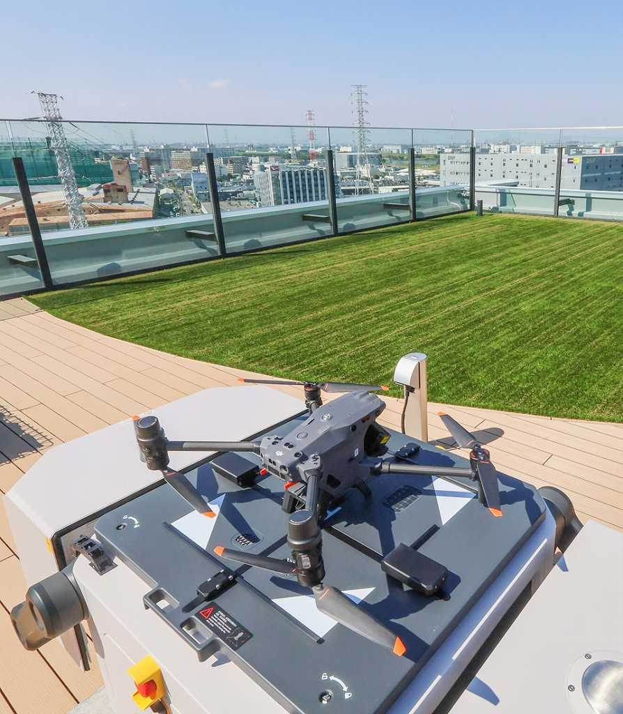 A drone takes off from a mobile port for a demonstration flight to inspect the exterior walls of the MFLP/LOGIFRONT Tokyo Itabashi facility in Itabashi Ward, Tokyo, during the facility’s preview and completion ceremony on Oct. 2. A scene like this will likely become an everyday occurrence at the site.