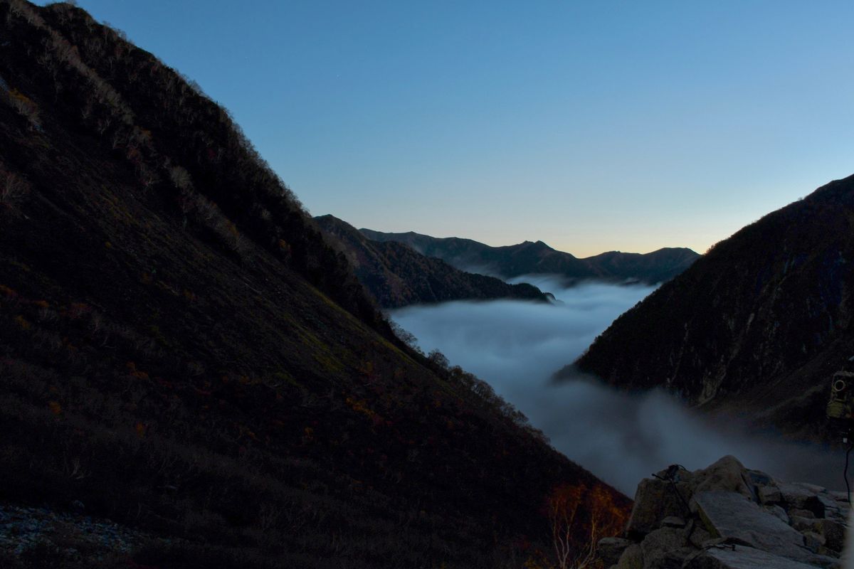At around 5:50 a.m. on Oct.19, the temperature in Karasawa Cirque was still below 0 C, and the dark sky was gradually brightening. Clouds crossed the eastern ridge of the mountains and quietly flowed into the valley.