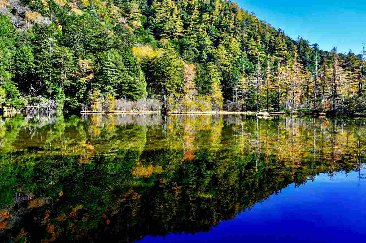 The mountain trees’ reflection is seen on the sacred Myojin pond in the Kamikochi area.