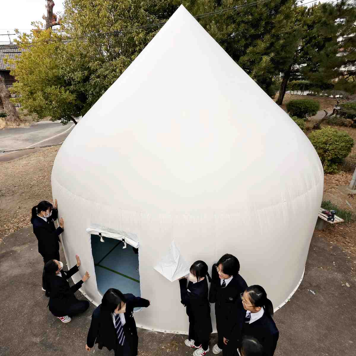 Students look at an Instant House on the grounds of a school in Nagoya.