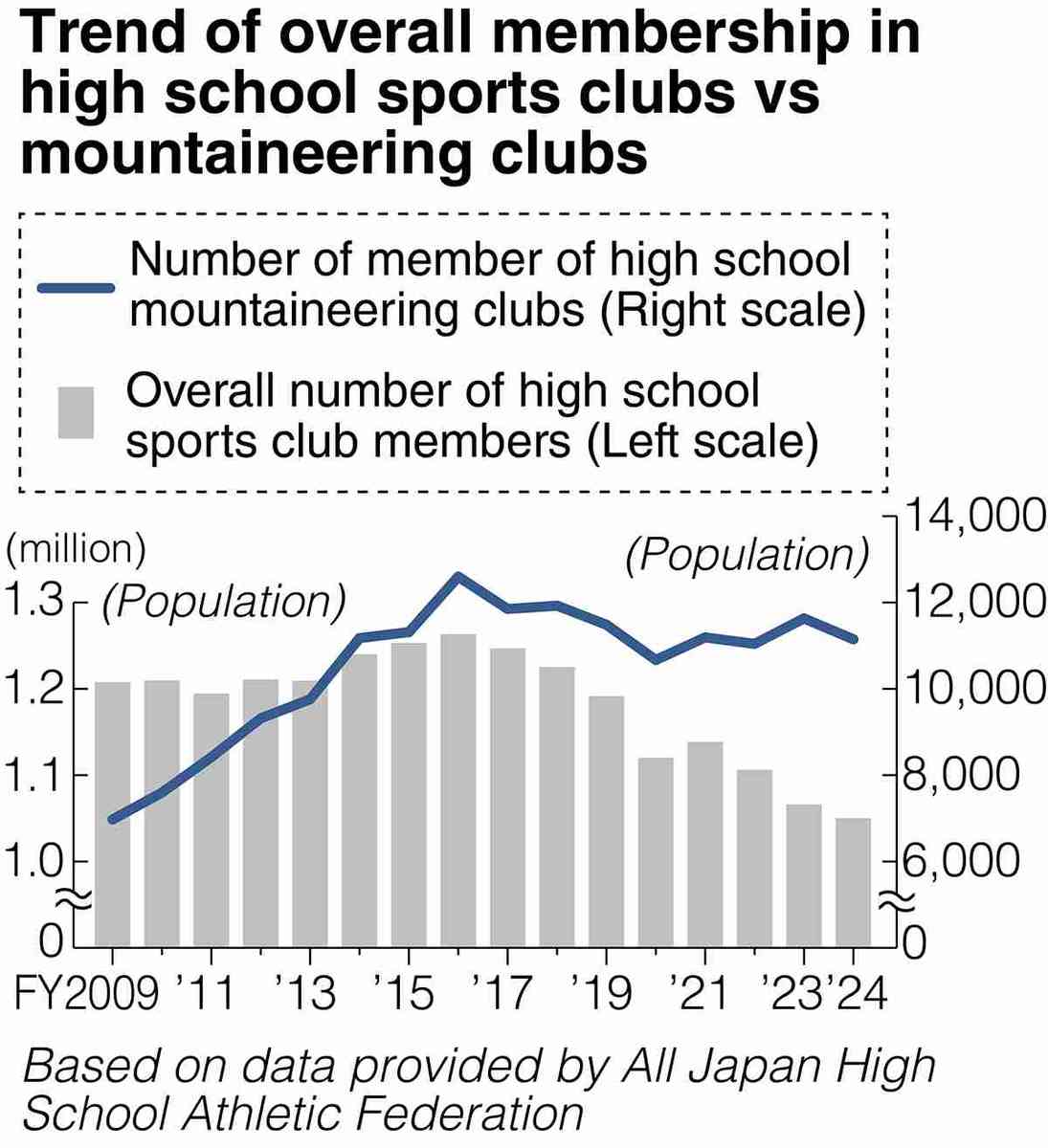 According to the All Japan High School Athletic Federation, students at its affiliated schools who were members of a sports club numbered about 1.21 million (760,000 boys, 450,000 girls) in fiscal 2009. That figure dropped more than 10% to 1.05 million (680,000 boys, 370,000 girls) by the current fiscal year.