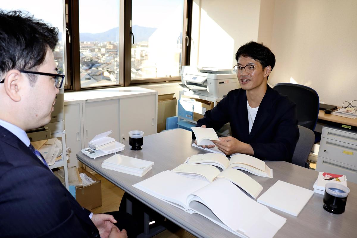 Ryo Sasaki, right, during a meeting in Minami Ward, Kyoto