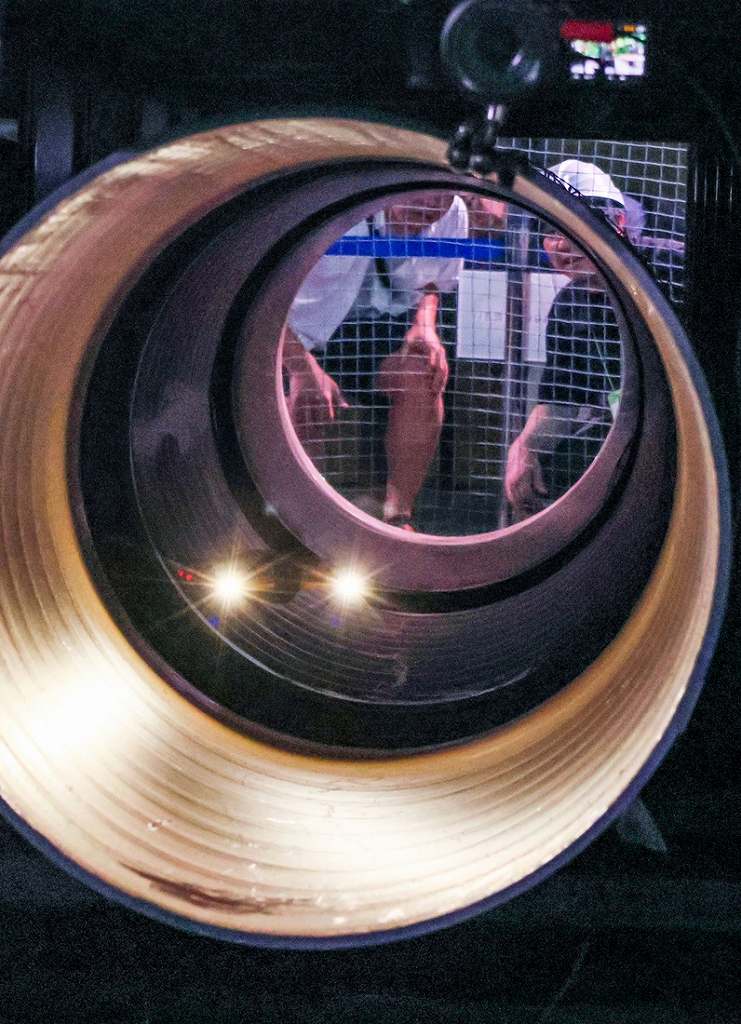 A drone with lights dashes inside a pipe in a space modeled after an underfloor space on the second day of the championship.