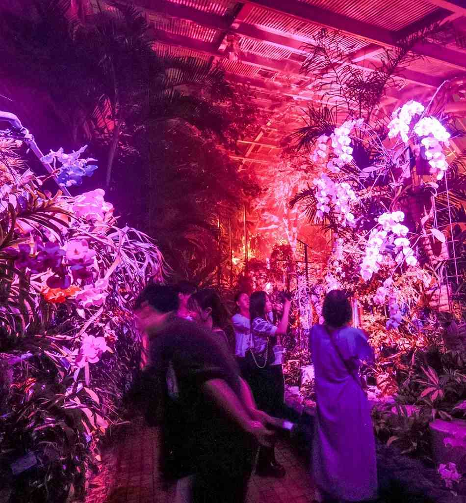 With biodiversity as the keyword for the event, the greenhouse is divided into four zones and suffused with light and sound. Visitors can enjoy the fantastic sights and smells of a wide variety of plants at night.