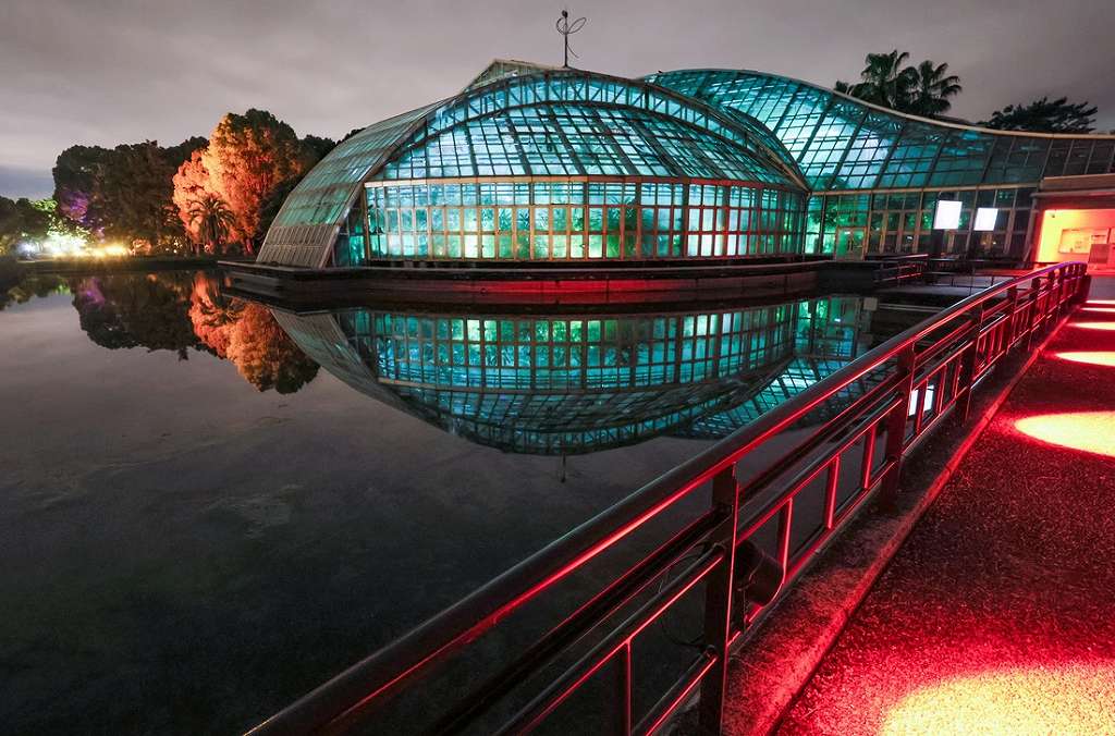 The Conservatory greenhouse of the Kyoto Botanical Gardens is illuminated at night.