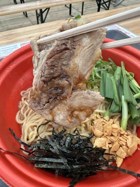 “Black pork nankotsu is a very rare cut that is not generally available,” said Mitsunori Hasuta, 60, an employee at a meat processing and wholesale company, which opened the pop-up ramen shop for the event. “This ramen can only be eaten here.” His tanned, rugged body exuded energy as he spoke, perhaps because of all the black pork nankotsu he eats.