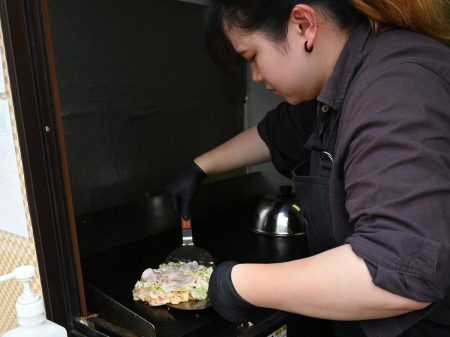 The first stall I visited was Bonne Qualite, where I ordered pork okonomiyaki. It’s the first food stall opened by the French restaurant Lumiere in Osaka. The restaurant’s famous chef designed the stall’s menu.