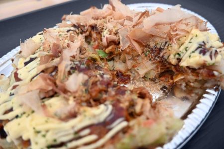 When it comes to Osaka’s specialties, you can’t ignore okonomiyaki, takoyaki and horumon-yaki. All of these hot dishes are cooked on a griddle, and the two days that I spent at the venue were incredibly hot. As the name “Sun Square” suggests, the sun was beating down relentlessly. Even though it was only June, the temperature was approaching 35 C, and it wouldn’t have been surprising if someone had dropped even before they’d started to eat. Despite the heat, the view of the 30 food stalls lined up with Osaka Castle in the background was truly impressive.