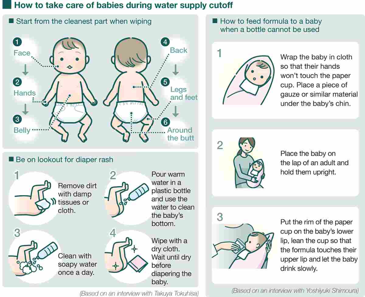 The important thing is to know how to keep a baby’s skin clean even when the water supply has been cut off.