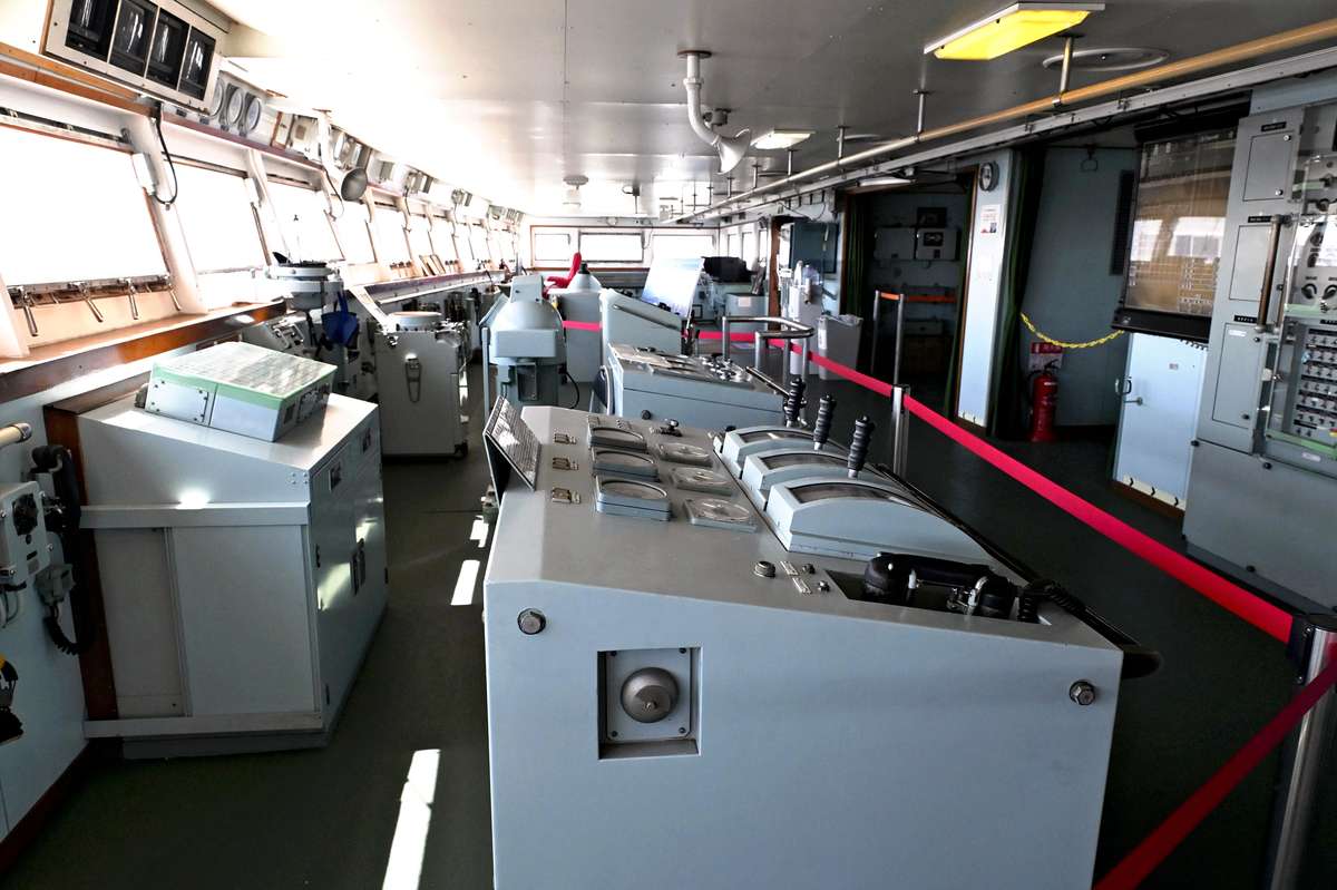 Left: The bridge with steering equipment Right: Shigeru Saigusa explains Antarctic research equipment