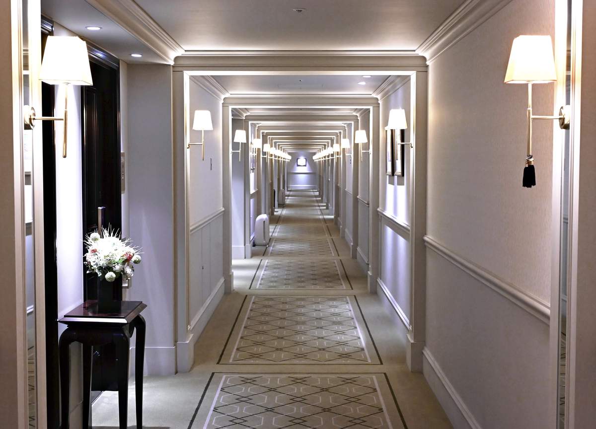 The carpeted hallway stretches on straight ahead. Antique-style lamps line the walls, casting a gentle light on the ceiling and floor. Time passes slowly in this elegant space inside a major train terminal used by 1 million people daily.