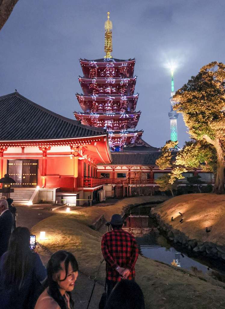 Visitors see images projected onto the temple’s five-story pagoda, center, in the temple’s Demboin Garden during the event, with Ema Hall seen on the left and Tokyo Skytree on the right in the background.