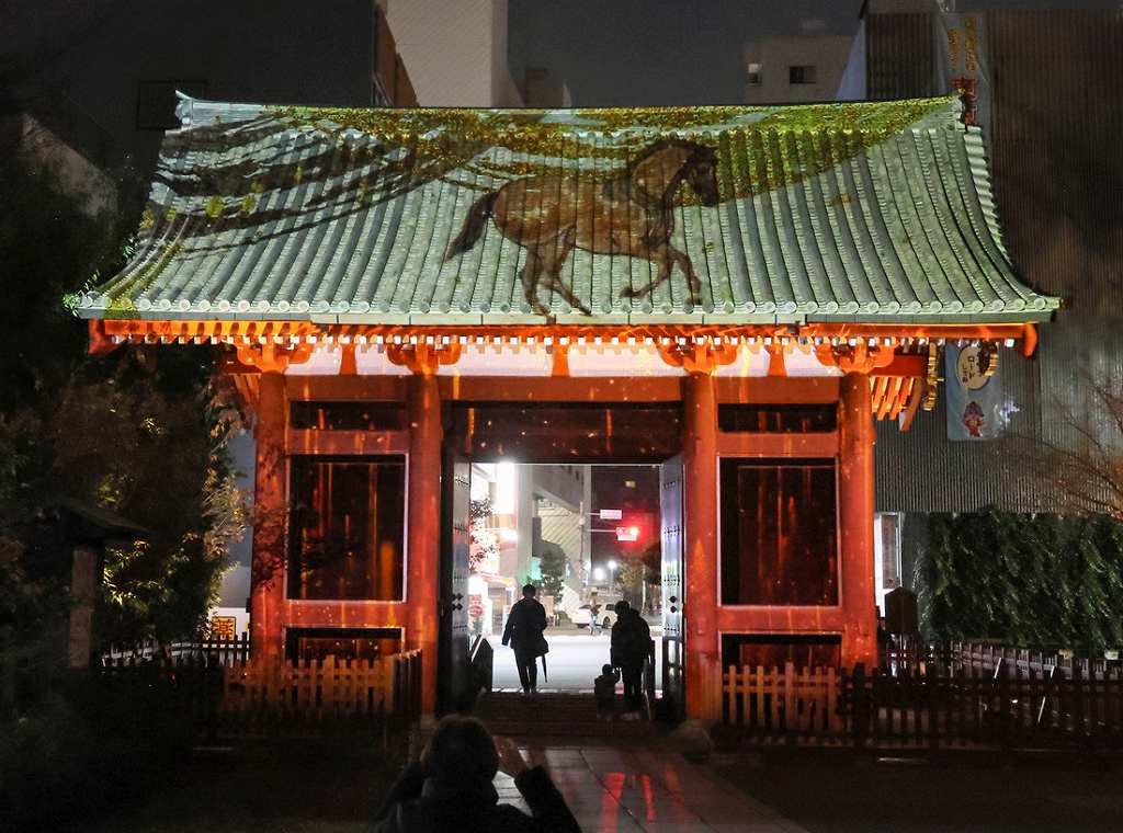 An image of a horse is projected onto the Niten-mon Gate, which has been designated as a national important cultural property.