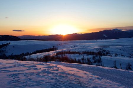 After walking for about an hour, the eastern sky started to brighten in shades of pink and orange, and the gentle slope of the land gradually became visible. When the sun’s first rays reached the plateau, the snow took on a pinkish hue, and my freezing body could feel the subtle warmth.