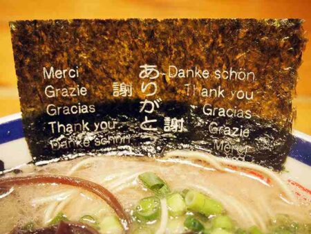 A piece of nori seaweed rests in a bowl of tonkotsu ramen with “Thank you” written in seven languages.