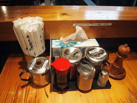 By then I noticed that the soup was almost half gone. I don’t typically drink so much of the soup when I have ramen because it tends to be too salty to drink. But the soup of Tanaka Shoten’s ramen went down as smooth as a potage soup would. I realized that that was probably what gave me the impression that the flavor was a bit weak when I had my first bite with the noodles. This subtle flavor allows the customer to freely create their own flavor by mixing and matching the various toppings available. It was my first time truly realizing the charms of tonkotsu ramen. It’s not just any ramen dish, it’s a soup that lets you change the flavor to suit your palette. In that moment, the way I saw ramen was forever changed.