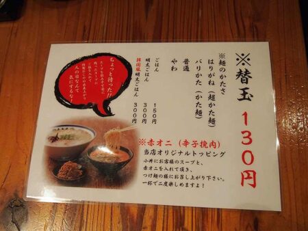 After taking a look at the menu, I saw that there were other toppings customers can choose from — seasoned egg, bean sprouts, wood ear mushrooms …… and akaoni (red demon)? I was a bit curious about what akaoni could be, but I was already full. I also wanted to have my usual seasoned egg, but I was so nervous that I forgot to order it. I regretted not coming on a completely empty stomach.