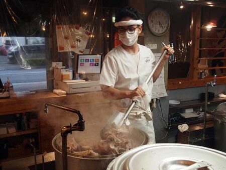 Store manager Hidenari Sato mixes the pork bones for tonkotsu broth in a stockpot.