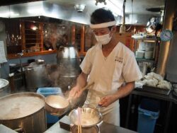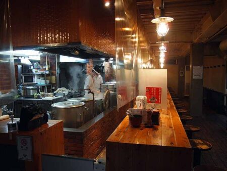 The restaurant’s seats surround the kitchen in which there are three stockpots 60 centimeters in diameter and 53 centimeters tall. You can watch the staff as they stir pork bones in the stockpot with an oar-like stick. These stockpots seem to be the source of a peculiar odor that is noticable even outside of the restaurant.