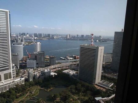 Kyu Shibarikyu Gardens is seen in the bottom, and Tokyo Bay, the Rainbow Bridge and the Ferris wheel are seen in the distance.
