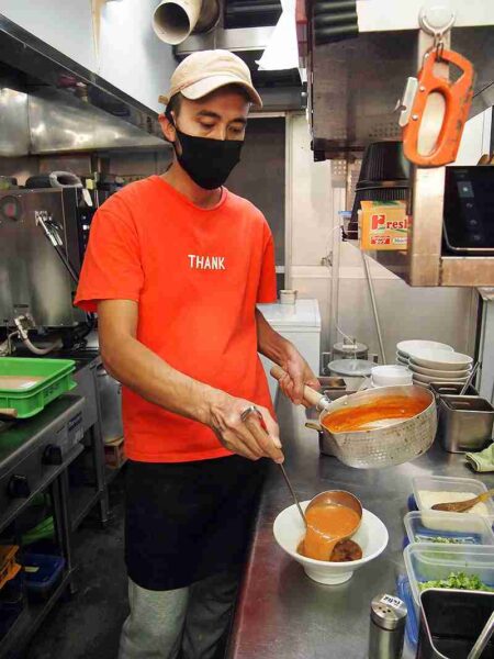 Toshiyuki Nagaoka, a shop manager, pours chili tomato soup into a bowl.