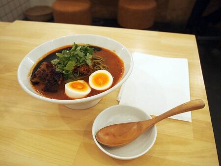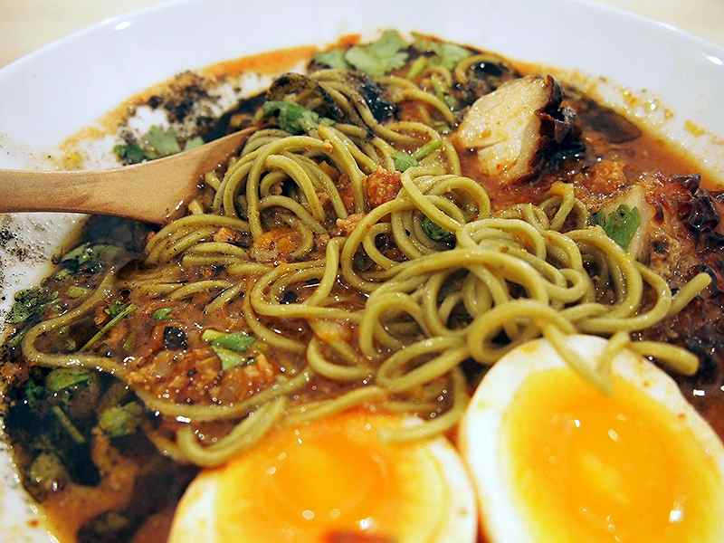 Red soup, green noodles, brown chicken taco meat, green cilantro, black garlic oil and tandoori chicken. So many colors! I spooned up some soup right away. The sourness and umami of the tomato spread throughout my mouth. I mixed some noodles with the soup and slurped up a mouthful. It smelled a little like Japanese matcha green tea powder. Was this the characteristic of Moringa? Another bite. I mixed in a little bit of the taco meat, giving it a hint of Latin flavor. Another bite. Mixed in the coriander and it felt like I was in Thailand. Another mouthful. The tandoori chicken topping added a splash of India. The mixture changed from one bite to the next and not once did I tire of it. The egg I was looking forward to was not a seasoned egg but a salted egg. The delicious salty egg relaxed me with its familiar taste.