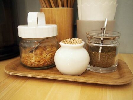 Free toppings are set on the table with fried Japanese leek, left, and sansho powder, right.