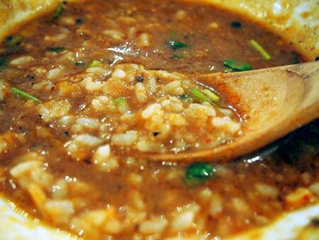 After the remaining taco meat was mixed into the soup, it thickened up. I was thinking, “You know what, I really don’t want to waste this soup,” when another customer, who seemed like a regular at the restaurant, said to the staff, “Mame please” and handed him a coin. Mame? There was no “Mame” (beans) listed on the ticket machine or for toppings! When I asked the staff about it, he told me it was a smaller than usual “small” rice. The price was reasonable at ¥50, so I forked over a ¥50 coin and said, “Mame, please” just as the other patron had done. To be honest, I was more interested in the ¥200 rice with cheese, but I just ordered plain rice. It arrived right away. I added it to the mix and presto! A delicious “risotto” was ready. All of the toppings were completely mixed, and the unique blend of umami, sourness, pungency and savoriness rolled around in my mouth.