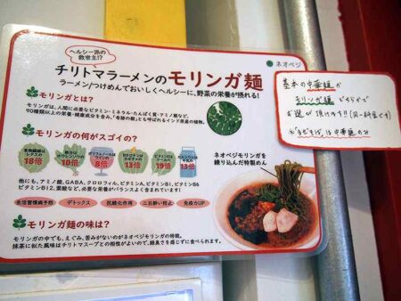 They serve chilitoma ramen, chilitoma tsukemen, and two kinds of mazesoba noodle (ramen dish without soup). Each ramen dish costs ¥850 (tax included). They serve cold chilitoma tantanmen noodle during summer.