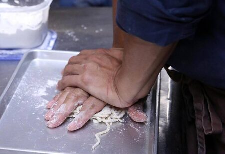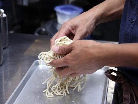 For customers to enjoy the different textures of the noodles, they rub and push the noodles to make them an uneven thickness and shape before boiling them.