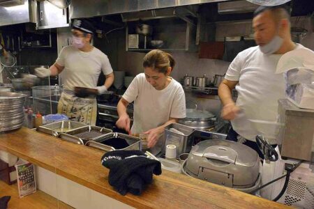 The first thing staff learn at this shop is how to make noodles. That’s why all the employees, including part-time workers, can make noodles in about three minutes. However, there is a difference in experience. When first learning, the noodles might look good, but they tend to fall apart when put in hot water. Staff members practice making them for themselves and other employees, and when they get a passing grade, they are ready to serve actual customers.