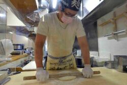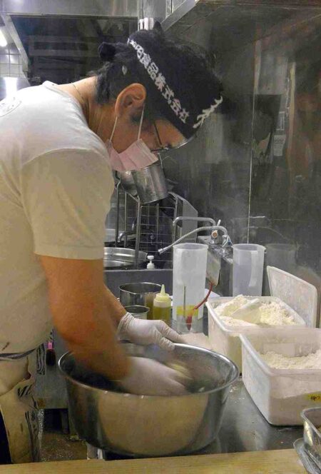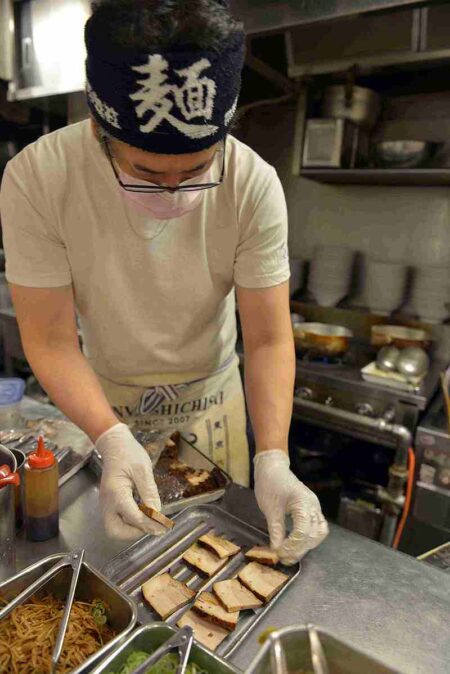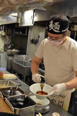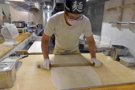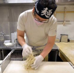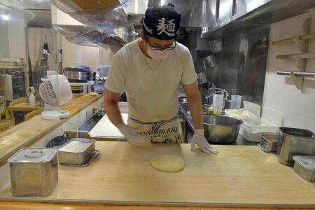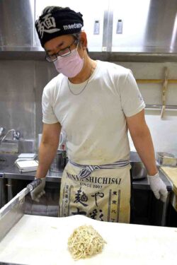“We don’t do this as a performance,” said Yoshihiko Fujii, one of the two co-owners of Menya Shichisai. “The main reason is to serve freshly made noodles and enjoy the taste and aroma of the flour itself. We can make noodles in the kitchen in the back, but if you don’t see them, you won’t believe it. Watching noodles being made makes the waiting time more enjoyable as well.”