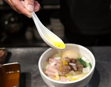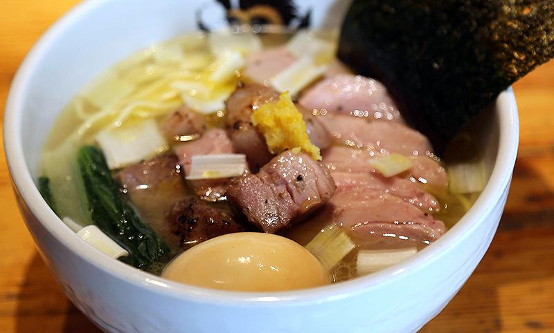 Diced thigh meat used for the topping is smoked-cured, then seared with a kitchen torch prior to serving to release oils that make the soup more delicious. “If you don’t put a lot of effort into it, anyone can do it. I want to be the only ramen shop of its kind,” Hashimoto said. The sliced leeks were fresh and dried seaweed abundantly fragrant. Every item is of the highest quality.