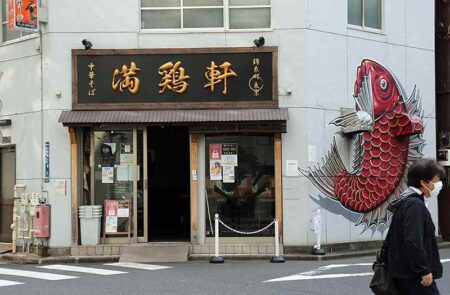 The area around Kinshicho Station is lined with shopping buildings and restaurants, making it one of the busiest on the east side of Tokyo. There are no shortage of ramen shops, and the area has been referred to as a “ramen war zone.” Among the most famous shops in this battleground are “Munch-ken” and its sister ramen shop, “Mengyo,” located in the nightlife district near the south exit. Munch-ken specializes in duck ramen, while Mengyo offers sea bream ramen.