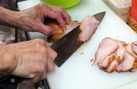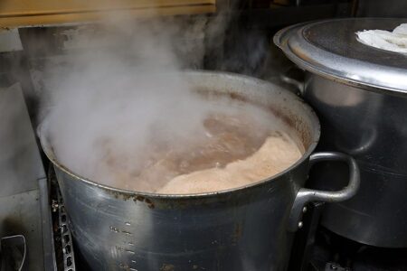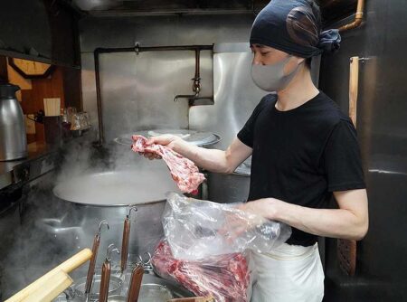 The ramen shop uses several hundred kilograms of pork bones per day. In particular, the pork backbone with lean meat helps deepen the broth’s flavor. To prevent the bones from smelling foul, chefs replace the bones while stewing the broth.