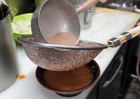 A sieve is used to remove bones when the broth is poured into a bowl.