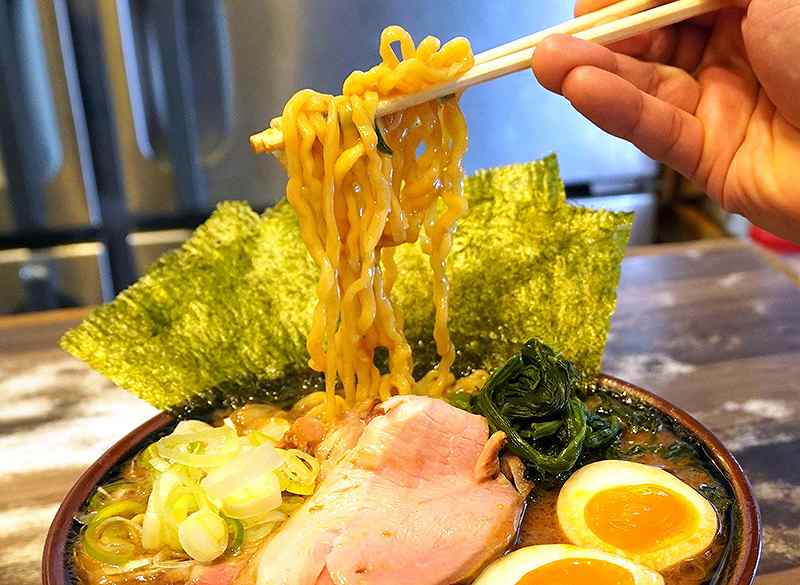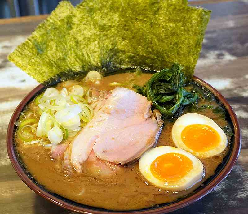 This type of the ramen, called “ie-kei” (Ie family), originated at Yoshimuraya, a ramen shop which opened in Yokohama in 1974. The kanji character “ie” means “house,” and it was used in the shop names of Yoshimuraya and subsequent shops, and that is why the tonkotsu shoyu ramen is called ie-kei ramen. This richly flavored ramen has become quite popular throughout Japan. The ramen shop offers a selection based around ie-kei ramen, though with its own unique twist on the broth, soy sauce and toppings.