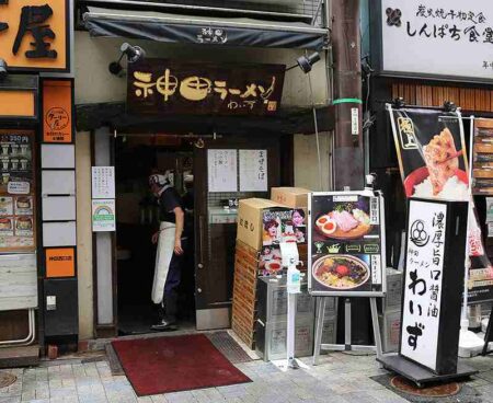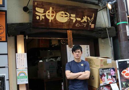 Ramen shop Kanda Ramen Waizu is packed with office workers at lunchtime as it celebrates 20 years since its opening. Located near the west exit of Kanda Station in Tokyo, their signature dish is tonkotsu shoyu ramen — a pork bone-based broth mixed with soy sauce.