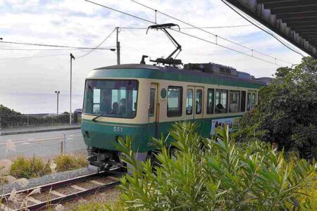 Enoden’s small train runs seaside in Kamakura.