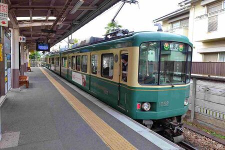 A lovely Enoden train departing from Wadazuka Station.