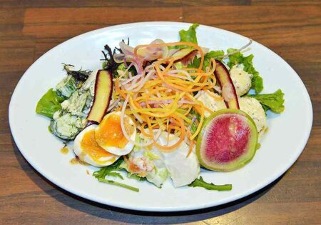 “Every morning, I shop at a market where the Kamakura farmers gather, and buy only the freshest locally grown vegetables. Because of that, the salad’s ingredients can vary from time to time,” Umezawa said, arranging some vegetables on a rather large plate. More than ten vegetable varieties, including turnips, dried persimmons, potatoes with honey mustard, daikon, red Chinese cabbage and watercress, were topped with hard-boiled eggs and a homemade Italian dressing based on Bagna Cauda. All of this for just ¥500 with a smaller serving size available for ¥280. What a bargain!