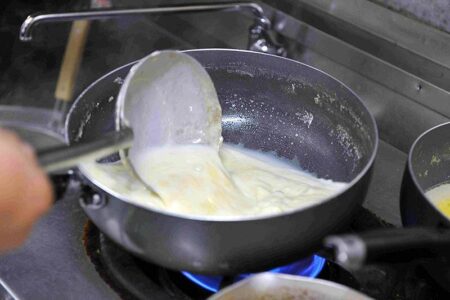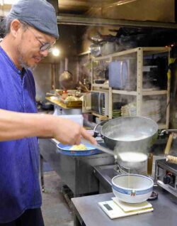 Umezawa prepares the soup for the soy-milk ramen.