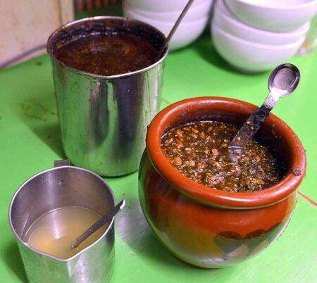 Super hot and spicy habanero sauce are being put onto the noodles.