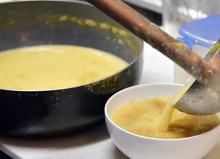 Tsukemen soup is poured into the bowl.