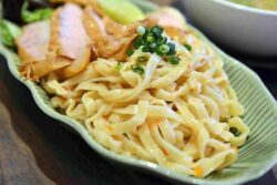 Noodles for tsukemen are flat and thick.