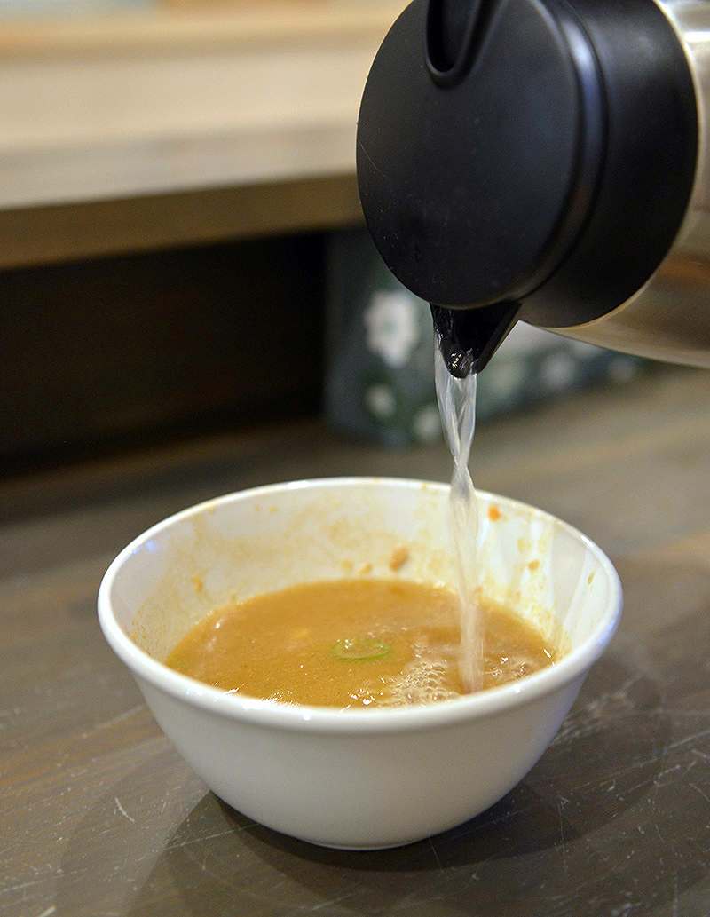 Because tsukemen broth is very rich and high in sodium, at the end of your meal, you can ask for some unseasoned broth to add to the soup and that will make it easier to drink.