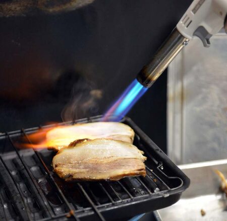 Pork belly chashu are given a quick sear with a handheld butane torch.