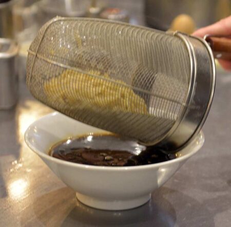 As the name suggests, this ramen features a distinctive, jet-black soup. I asked Juri Ishii, the shop’s manager, how they managed to make the broth so black. Ishii revealed that the key is tamari, an expensive soy sauce that has been aged for a year or more to achieve a sublimely thick, rich taste. “We start with a tamari-blend sauce that we then combine with our base broth and browned garlic oil,” he said, ushering me into the kitchen to demonstrate how the black ramen is made.