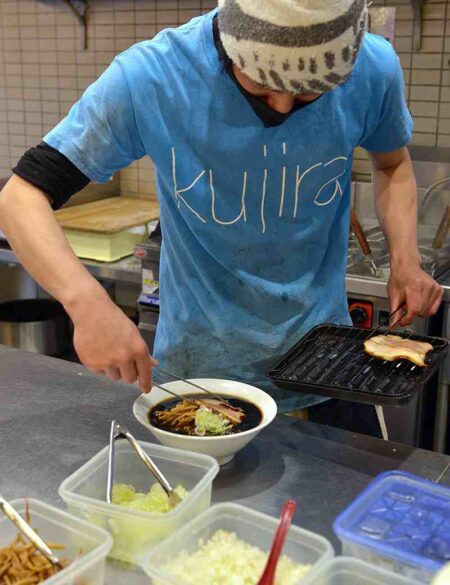 The name “kujira” came about on the suggestion of owner Kosuke Shimomura’s young daughter. Before opening the shop in 2013, he was searching for a name, when his daughter piped up, “I like whale!” Although the ramen shop is far from the sea, “kujira” struck him as an endearing, approachable word that reflected his vision to create an unpretentious place where people could share a filling meal together. The name stuck, and Kujira Shokudo was born.