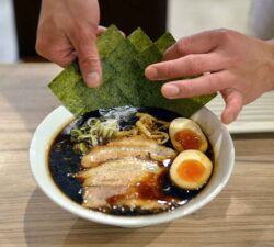 The now-boiled noodles were carefully added to the bowl, followed by two pieces of succulent pork belly chashu, which had been given a quick sear with a handheld butane torch for good measure. Sliced leek, menma bamboo shoots, and a halved soft-boiled egg were arranged atop the bed of noodles and given a dusting of black pepper. As a final artful flourish, the dish was garnished with three sheets of crispy nori seaweed.